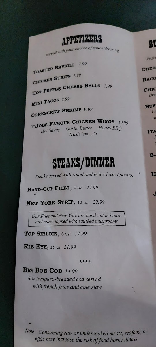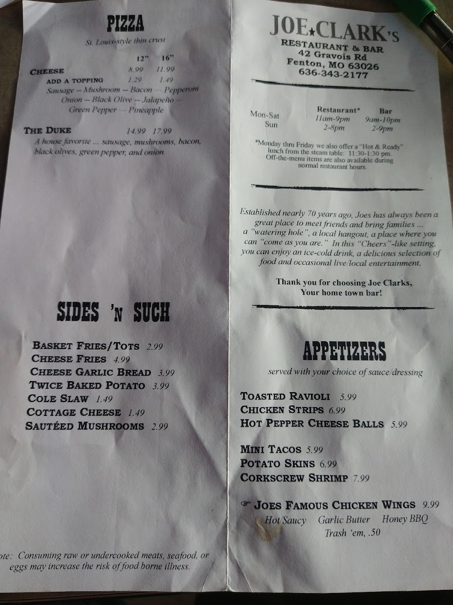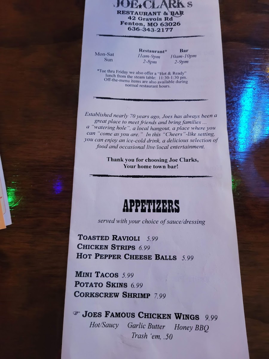 Joe Clark's Restaurant Menu